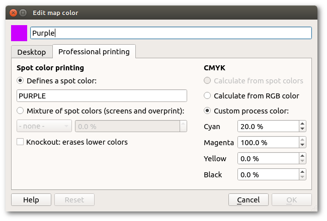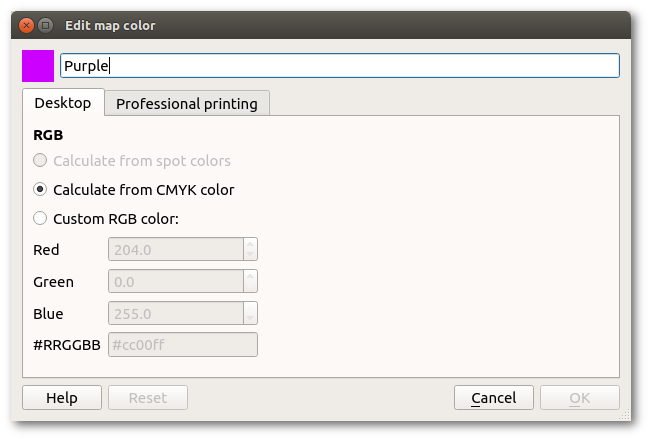 Today there are different methods for printing maps and the color editor in OpenOrienteering Mapper is adjusted to that, so there are different settings for “desktop” and “professional” printing.